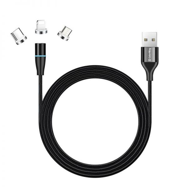 Характеристики Кабель ColorWay USB - Lightning + micro USB + USB Type-C (M/M), Magnetic Data/Quick Charge, 2.4 А, 1 м, Black (CW-CBUU038-BK)