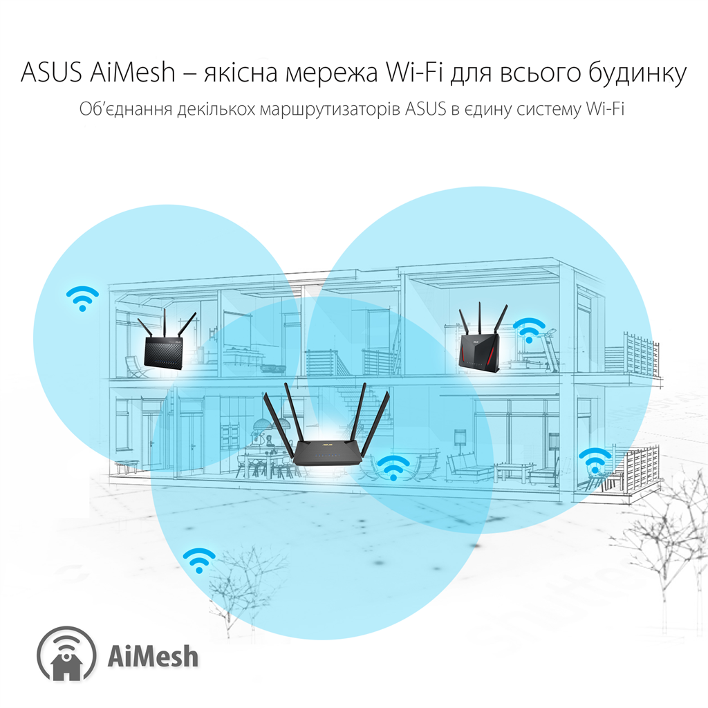 У рамках мережі AiMesh користувач отримує централізований контроль над усіма маршрутизаторами і автоматичне перемикання між пристроями. AiMesh – це надійність мережі Wi-Fi.
