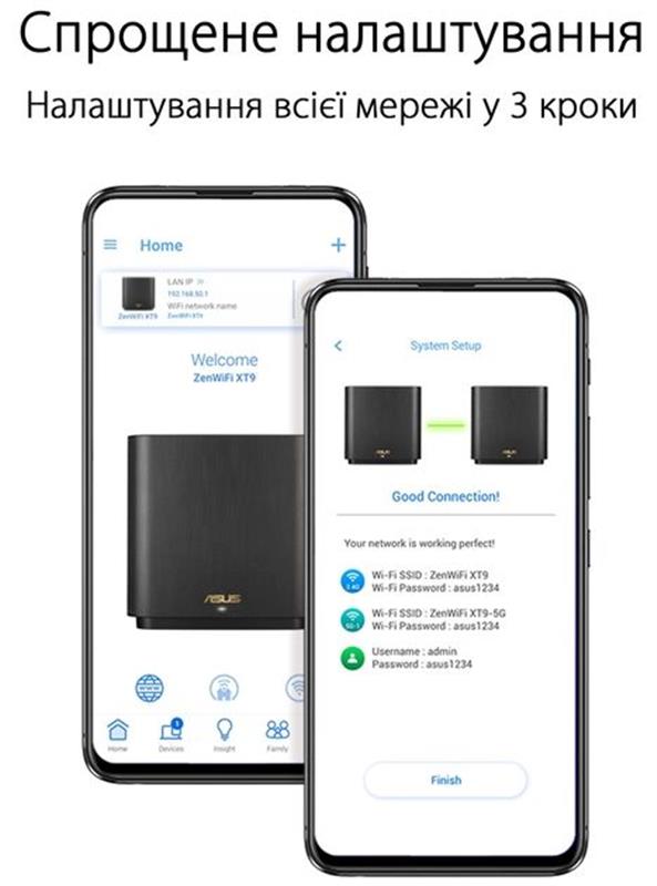 Мережа Wi-Fi для великого будинку. Mesh-система ASUS ZenWiFi XT9 складається з двох вузлів, кожен із яких є тридіапазонним бездротовим маршрутизатором ASUS класу AX7800 стандарту Wi-Fi 6. Доступні різні варіанти підключення вузлів один до одного, разом вони забезпечують покриття швидкісною, надійною й захищеною мережею Wi-Fi всього простору будинку. Захищена мережа Wi-Fi для великого дому. Розширена зона покриття. У поєднанні з флагманським чипсетом Broadcom стандарту Wi-Fi 6 ексклюзивна технологія ASUS RangeBoost Plus збільшує зону покриття мережі Wi-Fi на 38% – до 530 м2! Легкість налаштування та адміністрування. ASUS Router – це інтуїтивно зрозуміла програма для налаштування параметрів мережі Wi-Fi прямо зі смартфона.