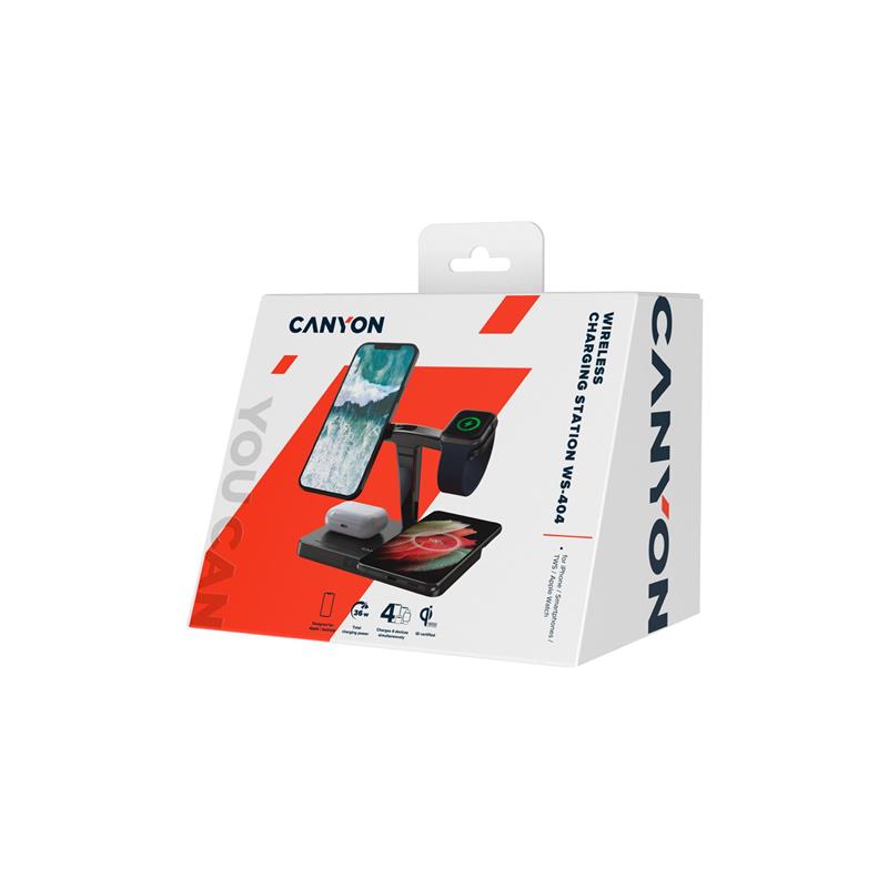 Швидке заряджання Canyon WS-404 забезпечує сильне з’єднання за допомогою магнітів. В основі зарядної станції лежить чіпсет "Bland", який оптимізує потужність заряду для кожного пристрою. Це дозволяє батареям мобільної техніки не перегріватись і служити довгий час. Особливість моделі у підтримці захисту на трьох рівнях – OCP/OTP/FOD.