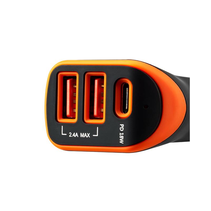 На додаток до двох класичних портів USB-A цей адаптер обладнаний USB-C портом із технологією Power Delivery. Тепер ви можете максимально швидко та безпечно заряджати пристрої USB-C кабелем від автомобільної розетки. Технологія "Smart IC" допомагає видати оптимальний струм і вихідну напругу для кожного під’єднаного пристрою. Зарядка обладнана всіма типами захисту, включно з захистом від стрибків напруги та короткого замикання. Цей адаптер можна використовувати в автомобілях із напругою мережі як 12 В, так і 24 В.