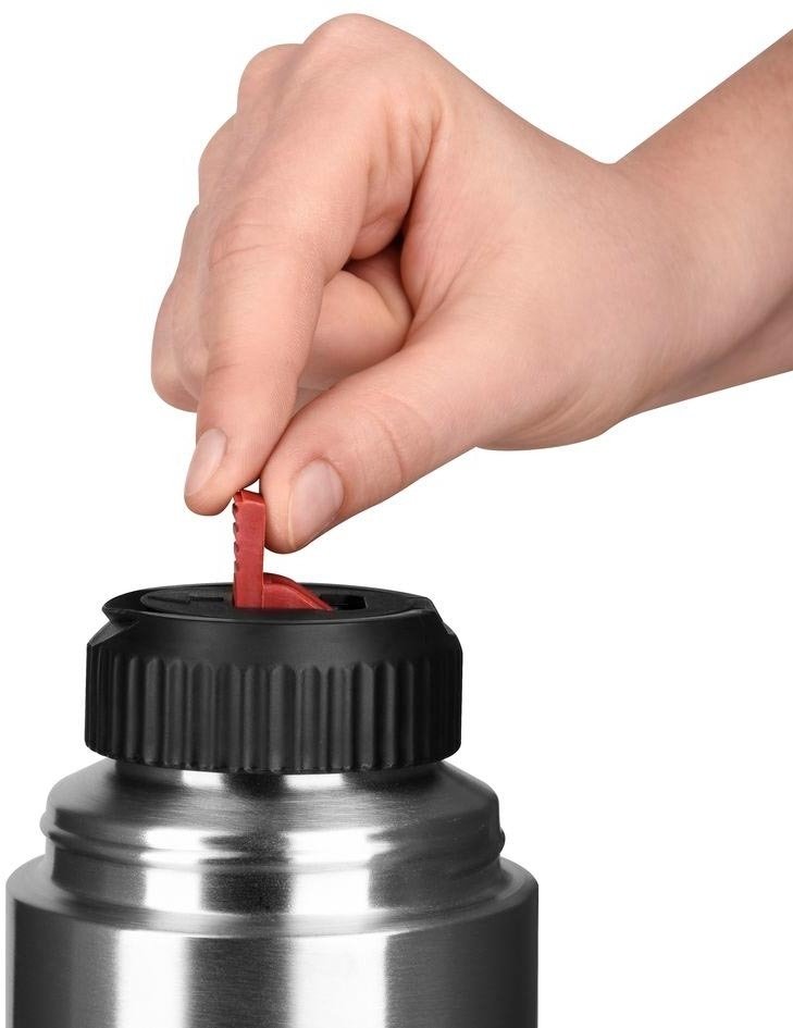 Клапан дає змогу наливати рідину, не знімаючи пробки. Термос можна без побоювання перевертати або класти на бік. Кришка може використовуватися як чашка.