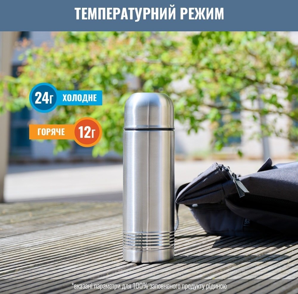 Термос зберігає тепло 12 годин, а холод - 24 години.