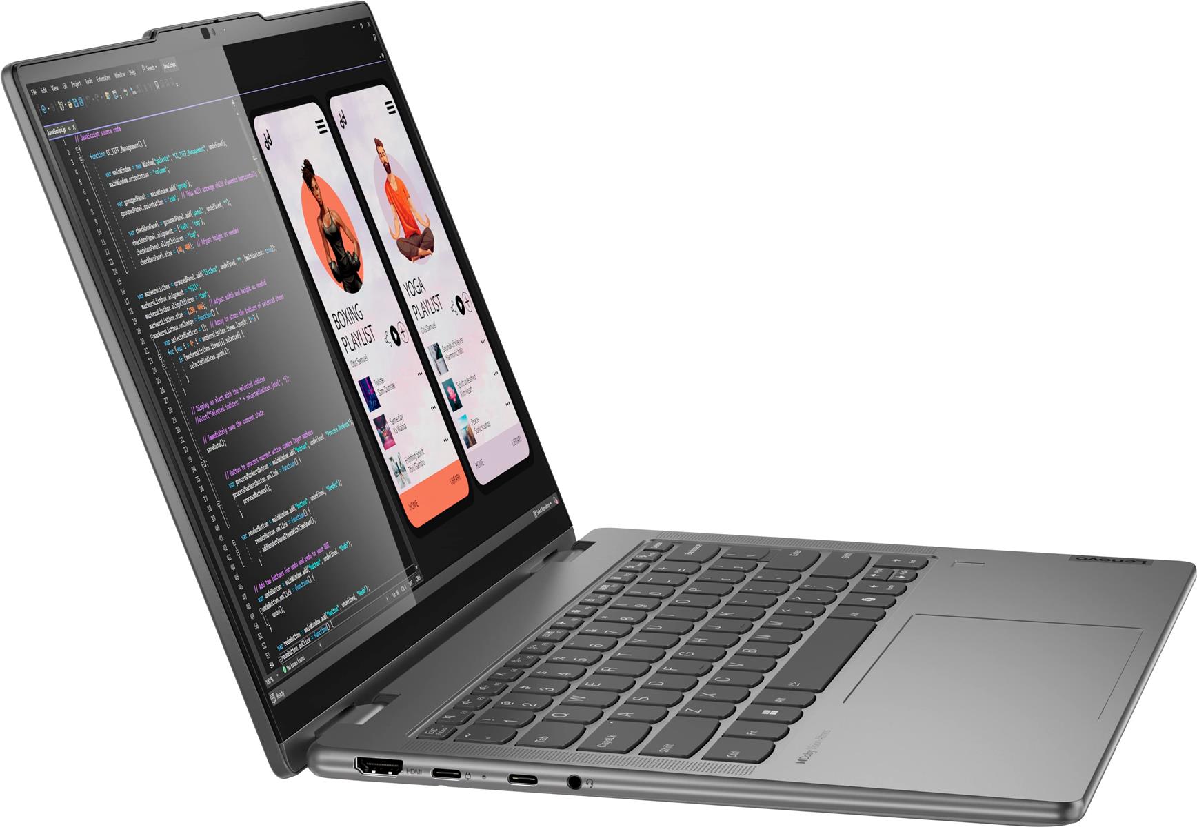 Yoga 7 вагою лише 1,61 кг легко носити з собою, а акумулятор забезпечує до 14 годин автономної роботи. Модуль Wi-Fi 6E гарантує стабільний зв’язок, а вебкамера 1080p з шторкою Privacy Shutter збереже приватність під час відеодзвінків.