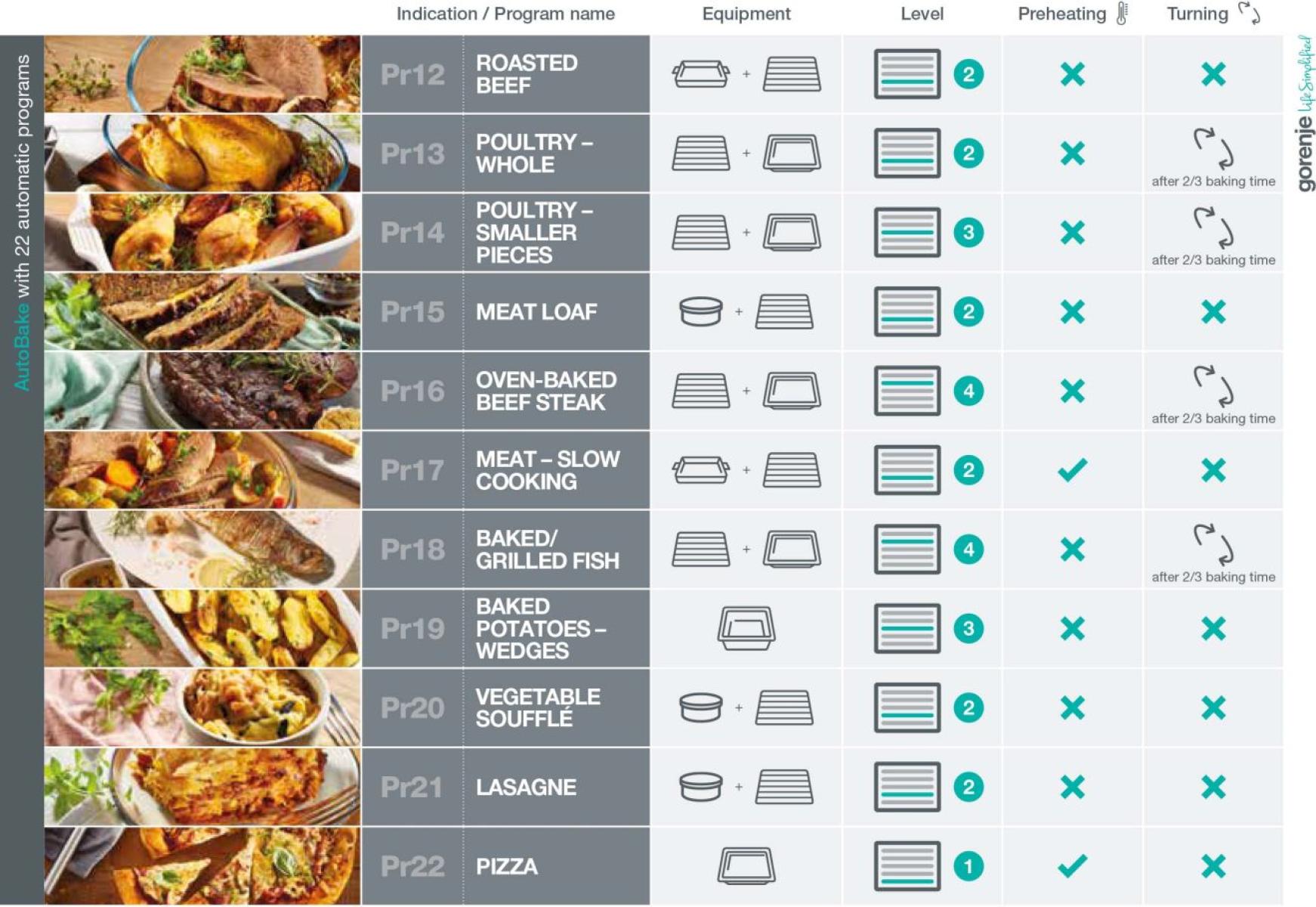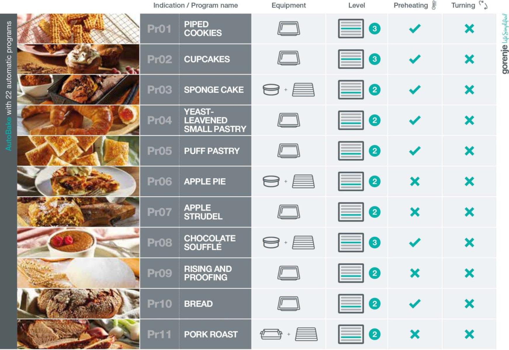 Вбудовувані духові шафи Gorenje OptiBake мають повністю автоматичні програми приготування страв з понад 22 рецептами — ідеально для початківців. Програми AutoBake пройшли ретельне тестування експертами Gorenje та довели свою надійність, демонструючи чудові результати навіть без розігрівання.Подекуди користувачеві потрібно вибрати тип страви, її вагу та натиснути кнопку запуску. Про все інше подбає електрична духова шафа.