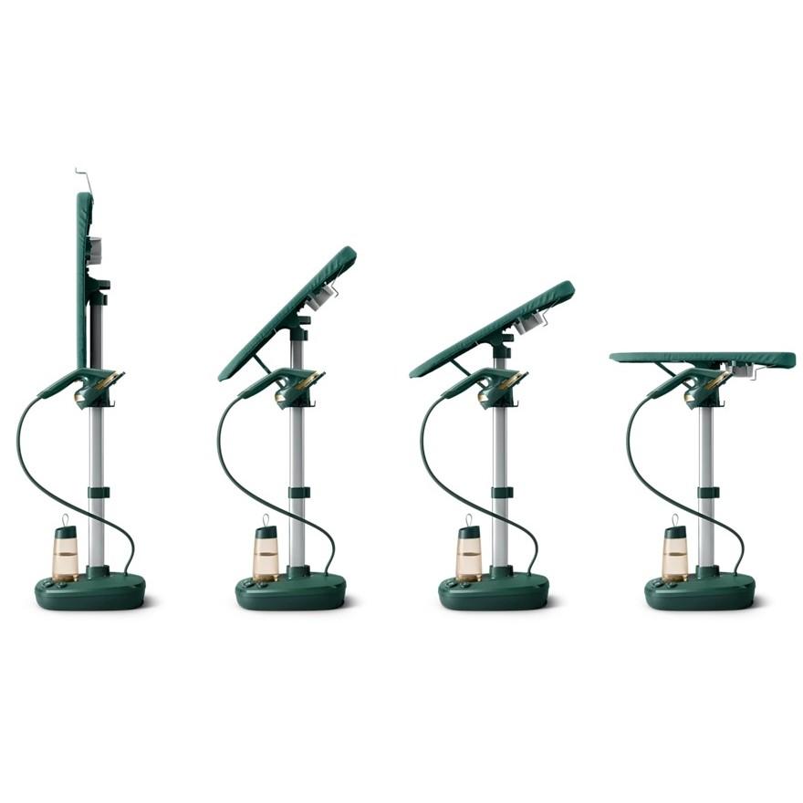Багатокутна прасувальна дошка може бути нахилена в будь-яке положення для зручнішого прасування: горизонтальне – для прасування найскладніших тканин, вертикальне – для відпарювання делікатних речей.