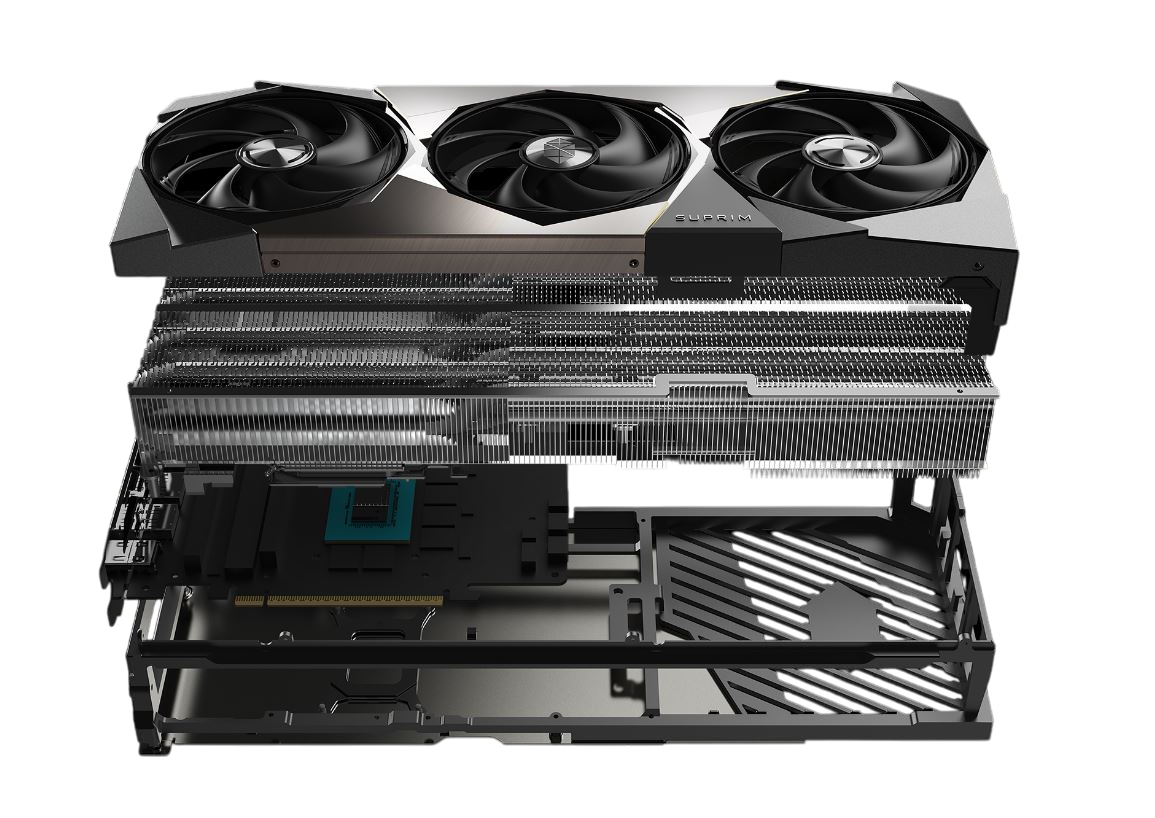 Важливою частиною системи охолодження є вдосконалена камера випаровування, яка ефективно передає тепло від графічного процесора і відеопам’яті до основної теплотрубки. Це забезпечує стабільну роботу відеокарти навіть за максимального навантаження. Основні труби з квадратним перетином ефективно відводять тепло, що у поєднанні з профільними ребрами, що знижують турбулентність, робить охолодження ще ефективнішим.