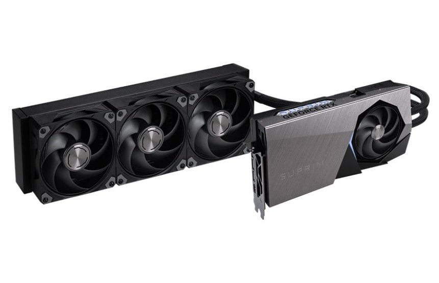 Відеокарта оснащена передовою гібридною системою охолодження, яка поєднує повітряне та рідинне охолодження для ефективного відведення тепла від GPU та відеопам’яті. 360-міліметровий алюмінієвий радіатор та вентилятор STORMFORCE забезпечують високу продуктивність охолодження та спрощують управління кабелями для чистого зовнішнього вигляду.