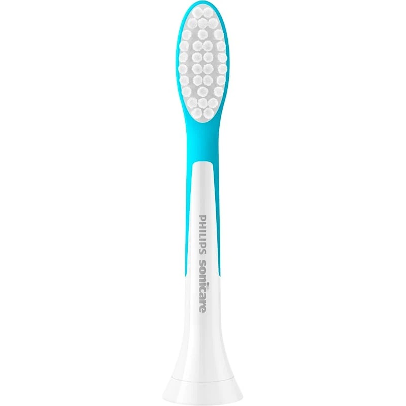 Ця насадка створена для дбайливого очищення дитячих зубів. Вона має м’які щетинки для ніжного очищення, контурний профіль для відповідності формі зубів дитини та м’яку гумову основу для додаткового комфорту у роті. Доступна також у меншому розмірі для дітей віком від 3 років.