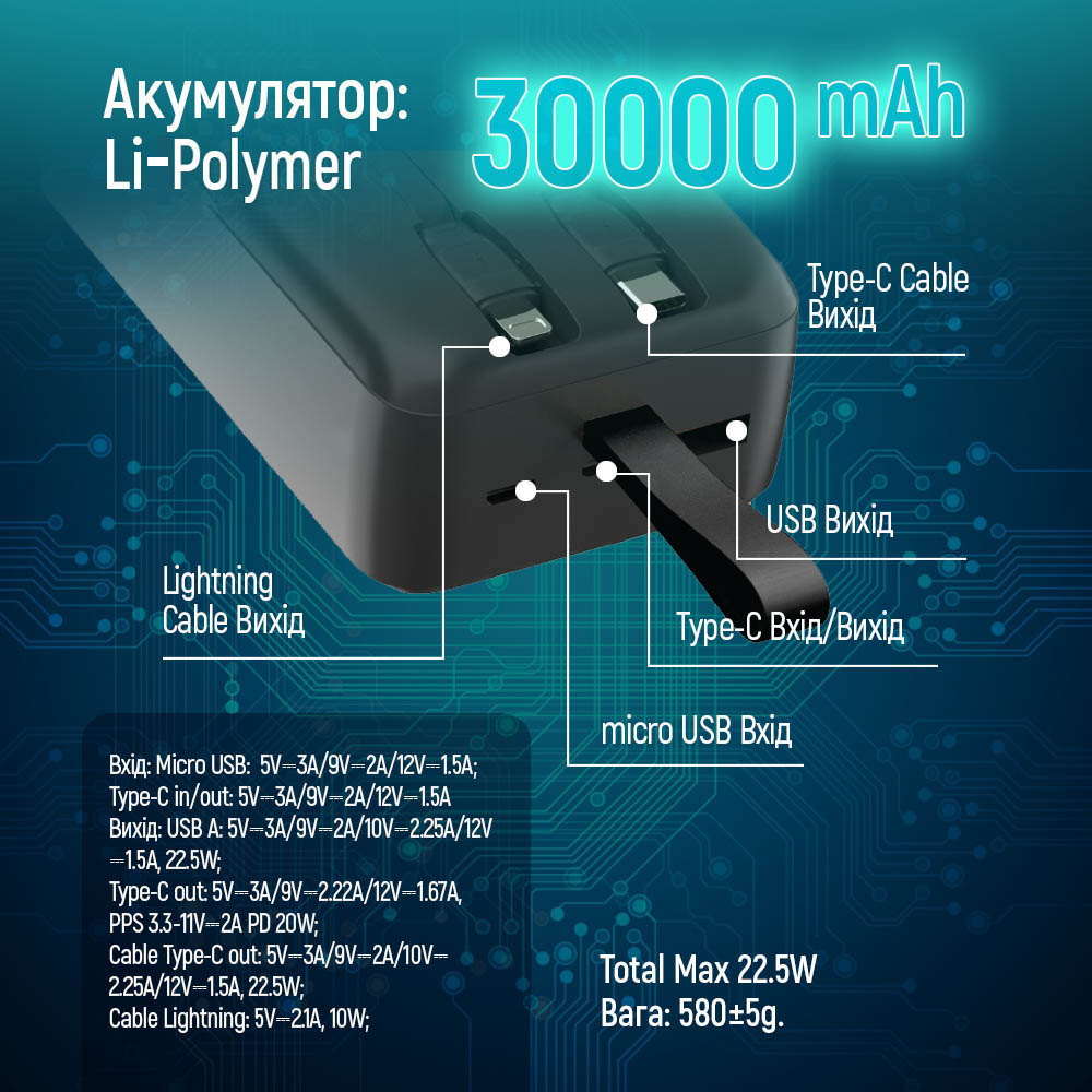 Акумулятор: Li Polymer 30000 mAh/3.7V/111Wh