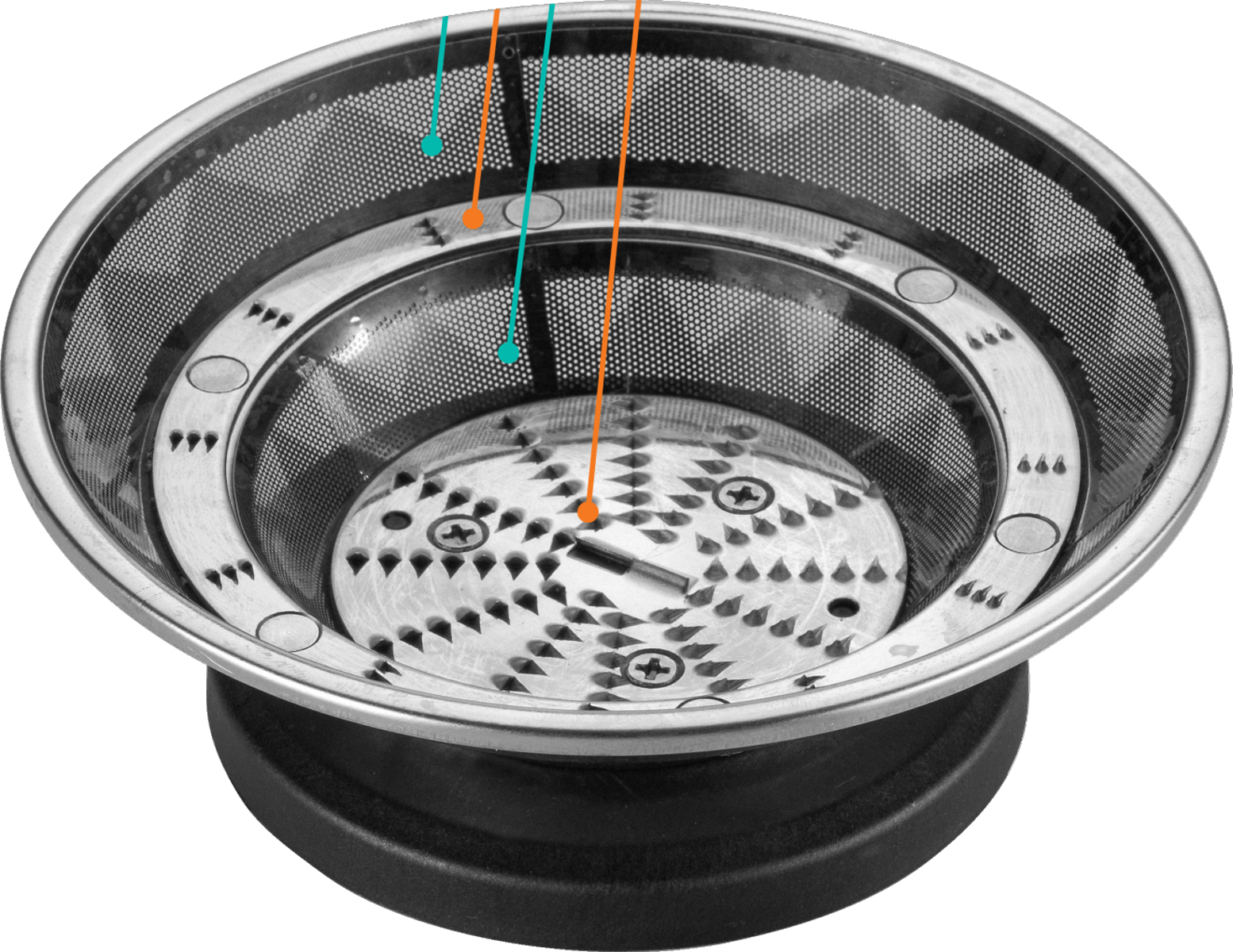 Підвищена ефективність вичавлювання соку завдяки пропусканню фруктів та овочів через спеціально розроблений фільтр. Фрукти перетирають на решітці для подрібнення та виділення соку. М’якоть, яка залишається, проходить через ще одну решітку й сітку, а потім відкладається в окремий кошик.