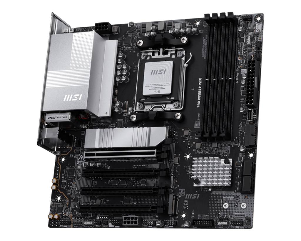 Материнська плата MSI PRO B850M-P WIFI — це компактна модель формфактора MicroATX на базі чипсета AMD B850, призначена для процесорів AMD Ryzen серій 9000, 8000 та 7000. Вона поєднує сучасні технології, такі як Wi-Fi 7, PCIe 5.0 та DDR5, забезпечуючи високу продуктивність для геймерів і професіоналів. Ця плата ідеально підходить для створення ефективних ПК з акцентом на ШІ та зручність складання.