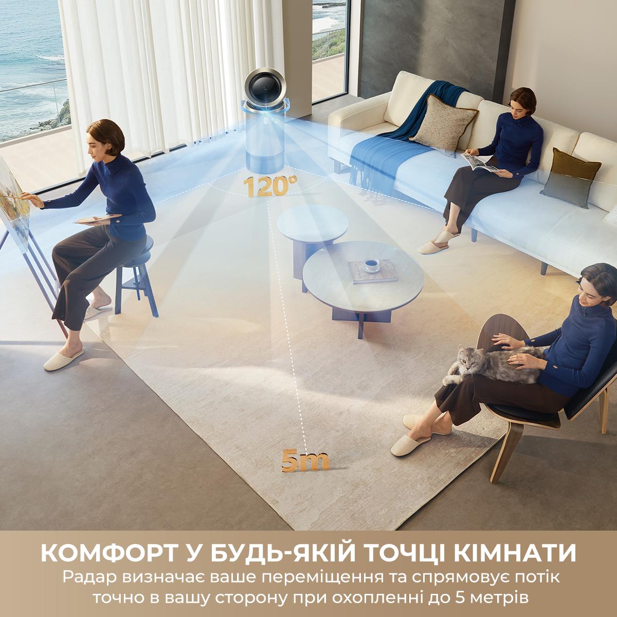 Передова технологія сканування довкілля з ШІ від Dreame автоматично вмикає пристрій, коли ви наближаєтеся на відстань до 5 метрів, і налаштовує напрям потоку повітря у ваш бік. Пристрій має поле відстеження 120 градусів і слідкує за вашим пересуванням, спрямовуючи потік свіжого повітря прямо на вас.