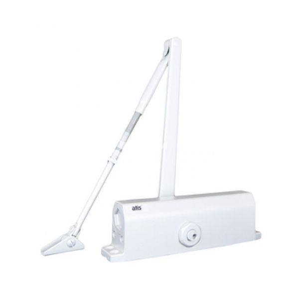 Доводчик дверной, белый. ATIS DC-5036 BC, две независимо регулируемые скорости Усилие закрытия: вес двери от 60кг до 120кг, ширина двери от 950мм до 1400мм, материал корпуса: алюминиевый сплав, исполнение тяги: рычажная, тип штанги: коленная, наработка на отказ: 1000000 циклов, рабочая температура: от -30°C до +50°C