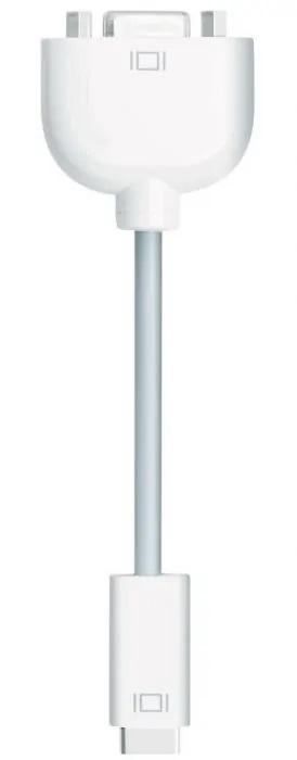 Apple mini DVI to VGA Adapter (M9320G/A) – фирменный адаптер Apple позволяет синхронизировать любой компьютер Mac при условии, что в нем есть Mini DVI порт с широкоформатным монитором или проектором. Этот маленький аксессуар позволит использовать монитор с широким разрешением как основной рабочий стол. Кроме этого вы можете приспособить этот переходник как инструмент для видеоповтора, то есть, транслируя видео через проектор, вы будете видеть то, что и ваши зрители.