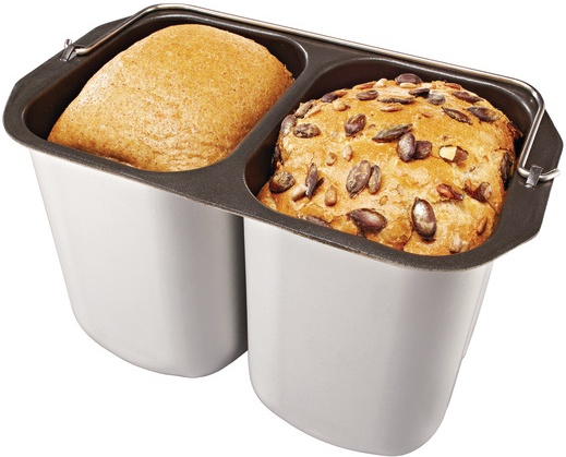 Две съемные формы с антипригарным покрытием позволяют за один раз испечь два вида хлеба: мягкий белый хлебушек и полезный цельнозерновой.