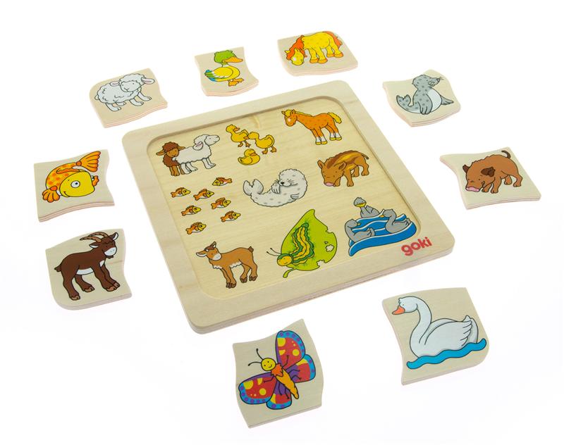В этой головоломке от немецкого бренда Goki ребенок должен правильно соединить пары – животные с их детенышами.