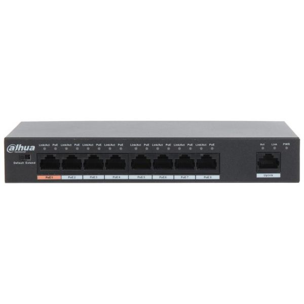 Dahua PFS3009-8ET-96 - это 8-портовый PoE коммутатор с поддержкой режима работы CCTV (передача PoE на линии до 250 метров). Обеспечивает скорость передачи по портам в стандартном режиме 100 Мбит/с, в режиме CCTV 10 Мбит/с. Переключение режимов работы осуществляется DIP переключателем на лицевой панели устройства.