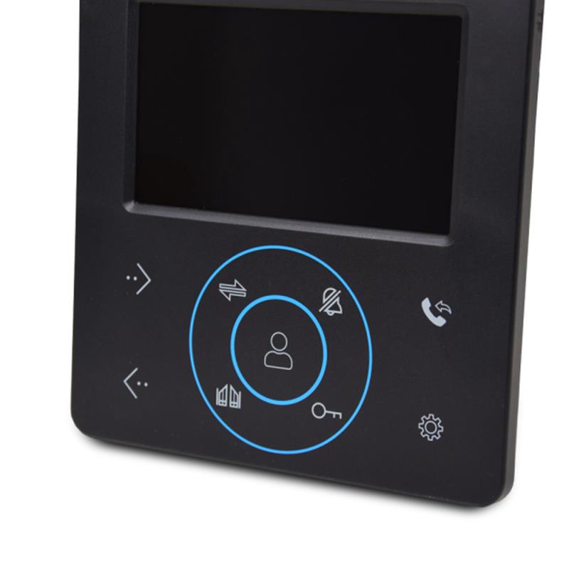 Комплект: видеодомофон и видеопанель. Цветной домофон с TFT экраном 4 дюйма и сенсорными кнопками управления, подключение 2 вызывных панелей. Разговор по громкой связи, есть интерком. Соединение с вызывной панелью 4-проводное. Питание 100-240V, потребление 8 Вт. Корпус домофона черного цвета. Цветная вызывная панель черного цвета с разрешением 1000ТВЛ и углом обзора 110°, с накладным способом установки.