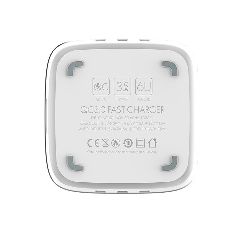 USB зарядное устройство премиум класса, c поддержкой технологии быстрой зарядки Quick Charge 3 и со встроенной интеллектуальной микросхемой USB Auto ID, которая автоматически определяет тип подключенного устройства и обеспечивает максимальный ток заряда. Умная зарядка быстро и безопасно может заряжать до 6-ти мобильных устройств одновременно: смартфоны, планшеты, внешние батареи и многие другие устройства.