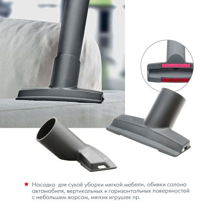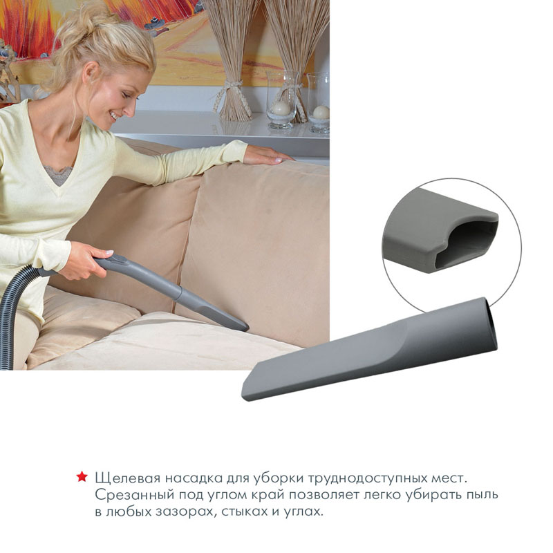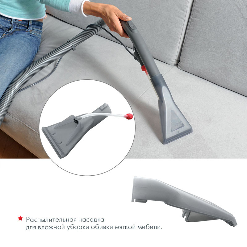 Пылесос отлично справляется также с сухой и влажной уборкой ковров и мягкой мебели. Он промывает ковры до основания ворса, уничтожает грязь и пятна и придает текстильным поверхностям свежий, обновленный вид.