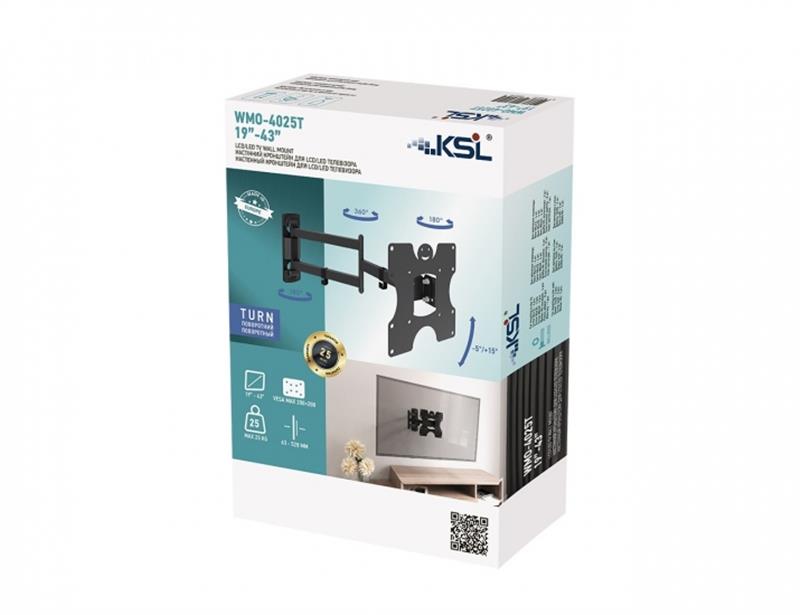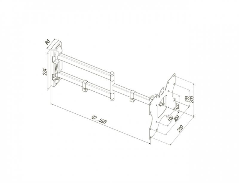 Кронштейн подходит для плазменных, LCD, LED телевизоров и мониторов с диагональю 19-43 дюймов и весом до 25 кг. Поддерживает стандарт VESA: от 100 ? 100 мм до 200 ? 200 мм.
