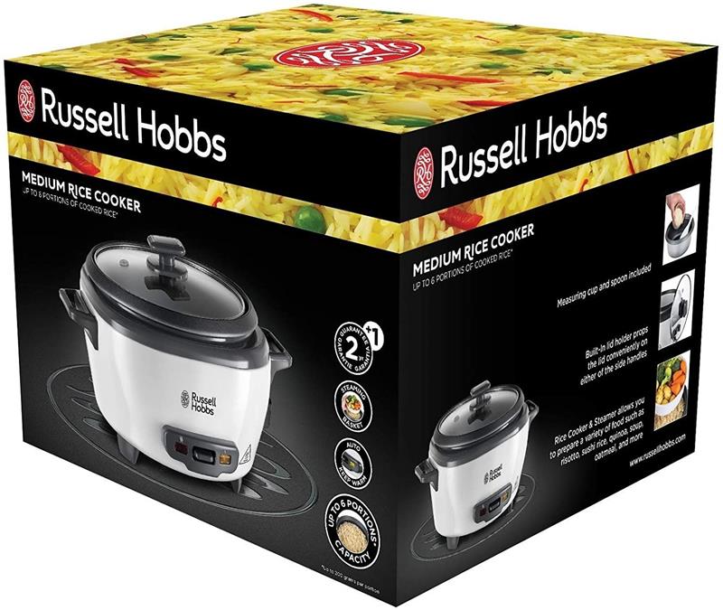 Рисоварка Russell Hobbs 27030-56 — современное электрическое устройство, которое рассчитано на 6 порций вареного риса (до 200 грамм на порцию). Данная модель станет отличным помощником в приготовлении не только вкусных, а и полезных низкокалорийных блюд.