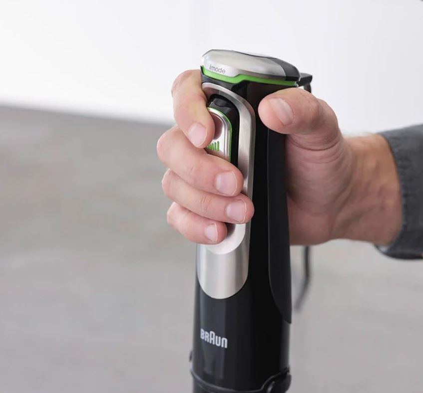 Погружной блендер серии MultiQuick 9. Максимальная мощность моторного блока: 1200 Вт. Количество скоростей: регулируемое. В комплектацию входит: моторный блок с системой EasyClick Plus и технологией SmartSpeed; металлическая блендерная ножка с острыми ножами из нержавеющей стали, выполненная по технологии ActiveBlade, PowerBell Plus и SplashControl; насадка измельчитель на 0,5 л с дополнительным ножом для колки льда; венчик для взбивания и перемешивания; мерный стаканчик с четкой мерной шкалой на 600 мл.