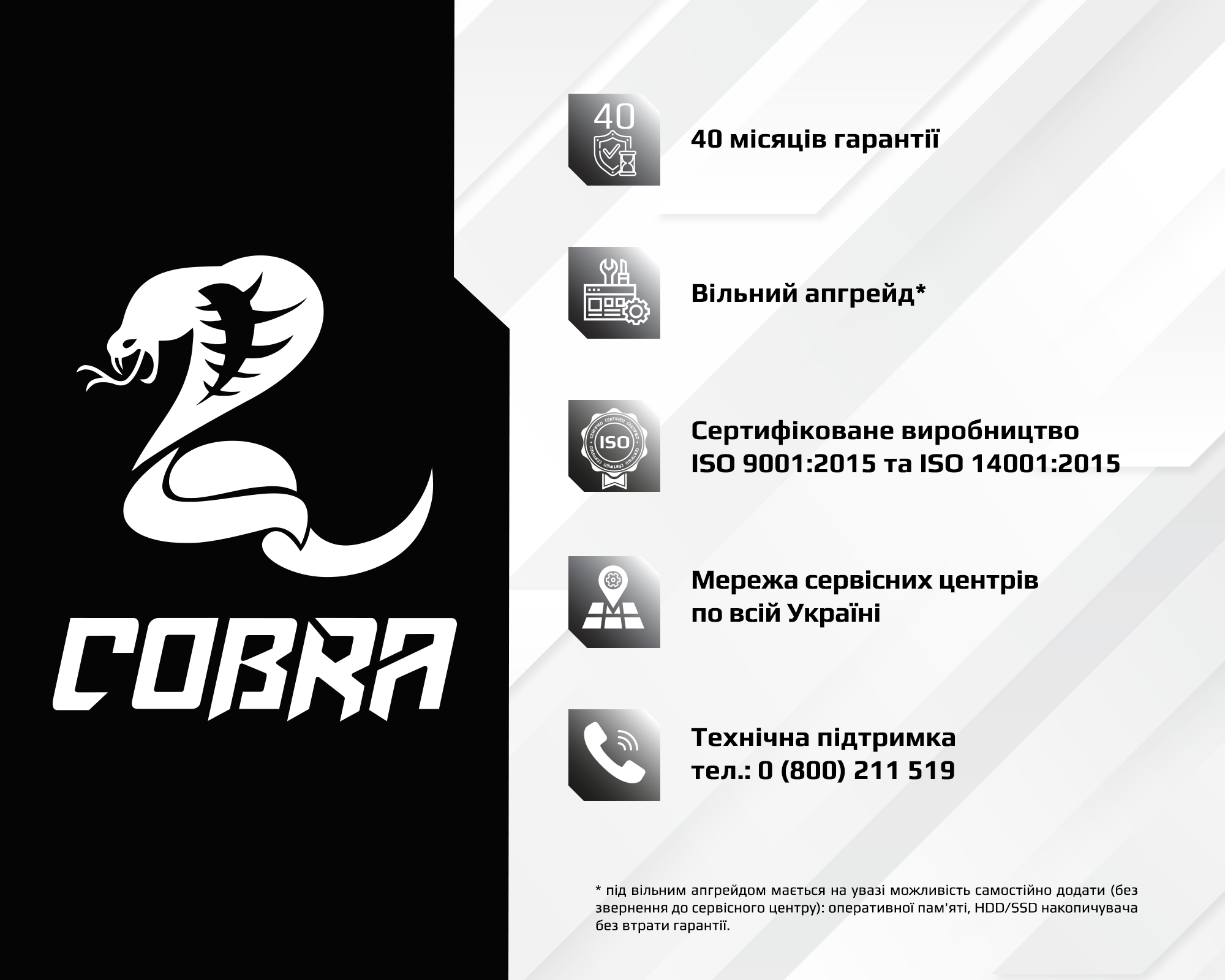 Игровые компьютеры COBRA с максимальной конфигурацией собраны специально для самых продвинутых пользователей и требовательных к качеству графики геймеров. Данная линейка позволит насладиться ультра настройками графики и максимальным разрешением во всех современных играх, сохраняя максимально доступные показатели FPS. Лучшего просто не существует!