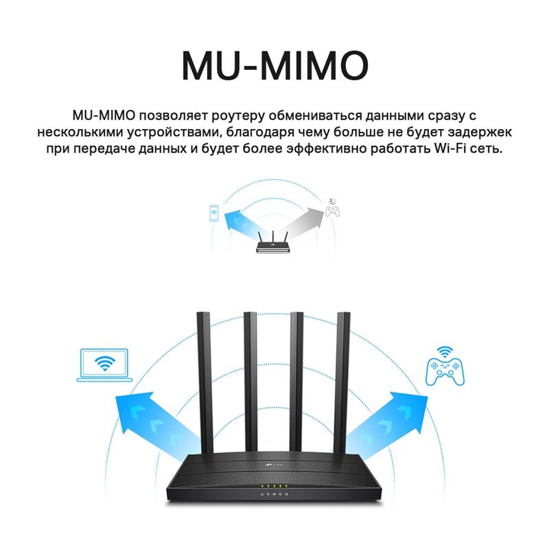 MU-MIMO позволяет роутеру Archer C6 обмениваться данными сразу с несколькими устройствами, благодаря чему больше не будет задержек при передаче данных и будет более эффективно работать Wi-Fi сеть.