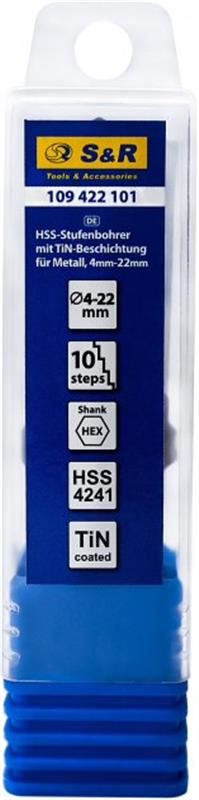 Сверло по металлу S&R ступенчатое — предназначено сверления и снятия фаски в металле и нержавеющей стали. Сверло изготовлено из быстрорежущей стали. Титановое покрытие увеличивает ресурс работы сверл и обеспечивает длительный срок эксплуатации. Имеет две широкие спирали для вывода стружки.