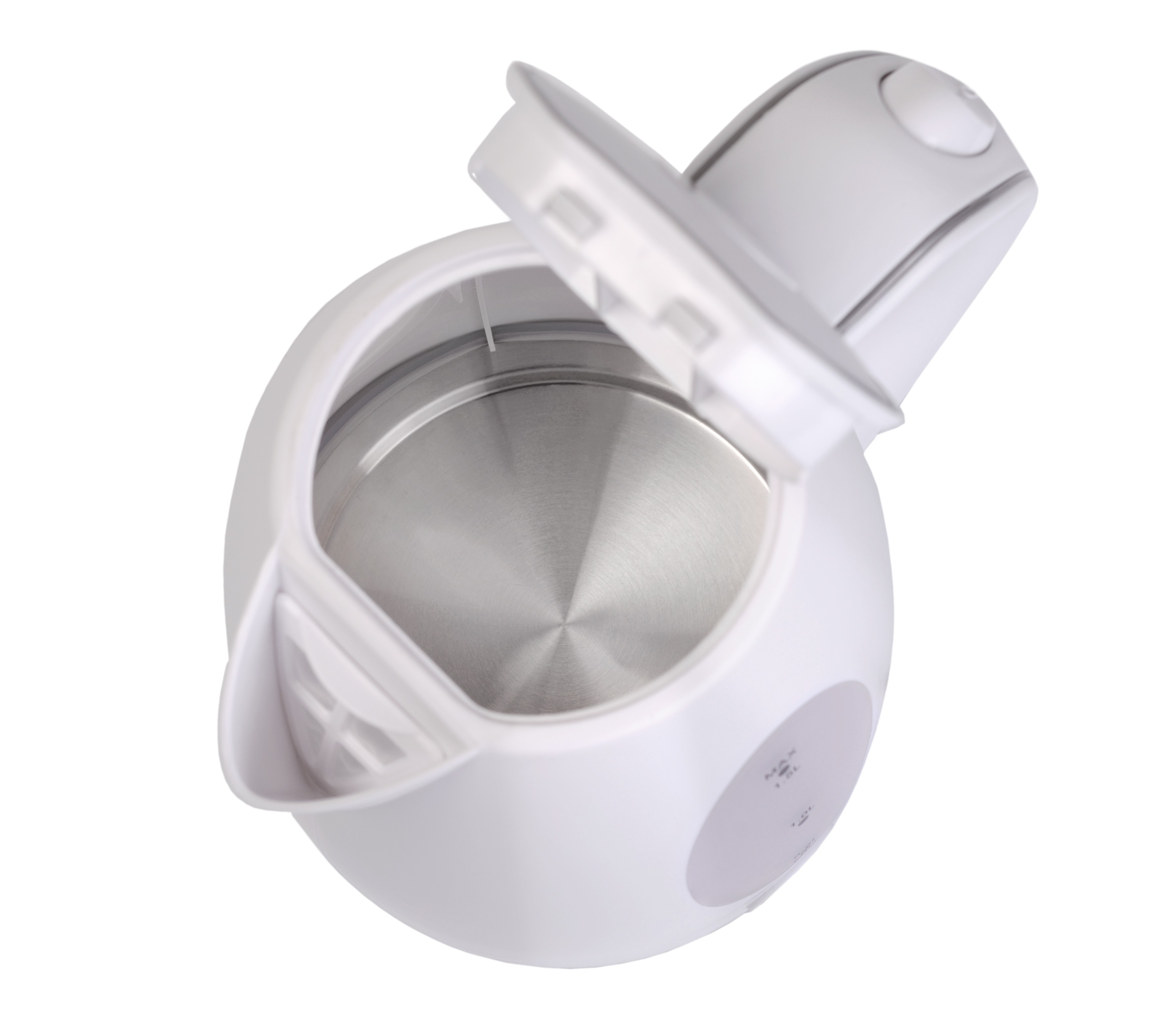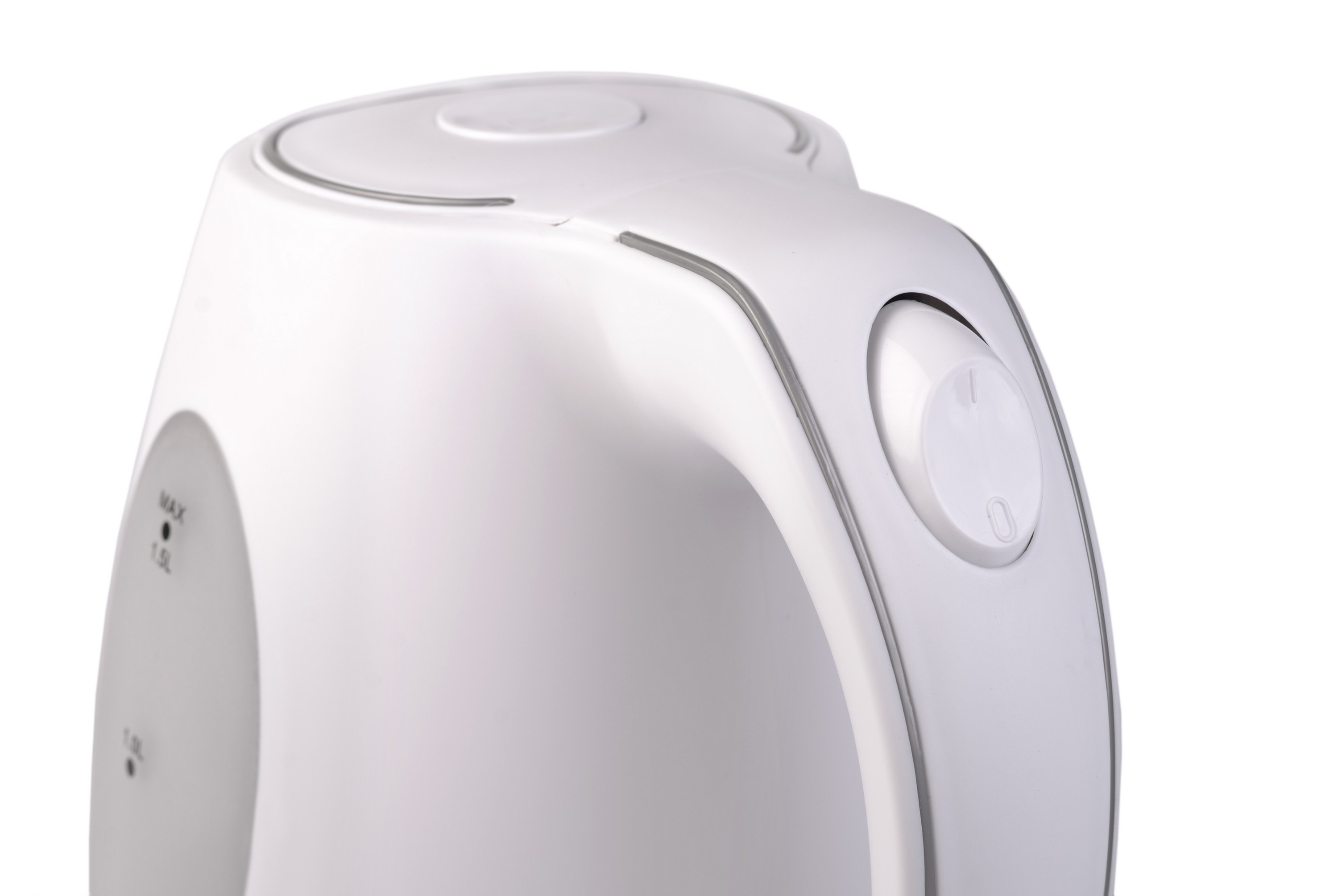 Для удобства пользователя чайник оснащен вращающимся на 360 градусов основанием и плоским дном. Белый цвет и неагрессивный дизайн. Позволяет вскипятить до 1,5 л воды. Оснащен нагревательным элементом из высококачественной нержавеющей стали и сигнальной лампочкой, сообщающей о том, что вода только что закипела.