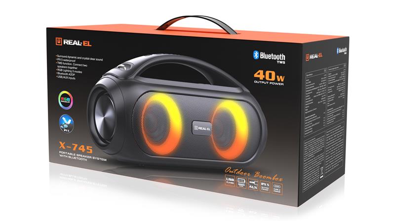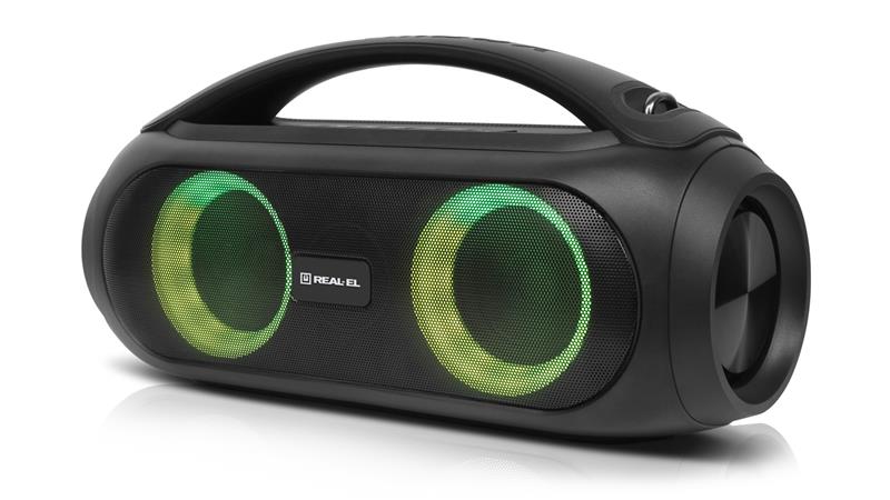 REAL-EL X-745 это стильный, мощный бумбокс с RGB подсветкой и функцией TWS.