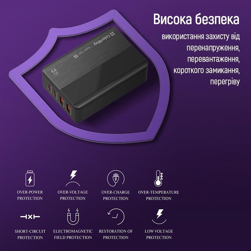 Характеристики Сетевое зарядное устройство ColorWay Power Delivery (2USB-A + 2USB TYPE-C) (65W) Black (CW-CHS040PD-BK)