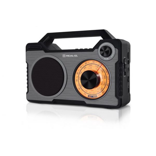 REAL-EL X-703 – не просто радиоприемник, а настоящий мобильный аудиоцентр. Помимо приема радиопрограмм, он может выступать в качестве Bluetooth-колонки и подключаться к внешним источникам сигнала с помощью провода. Наличие внешнего плеера при этом необязательно, устройство поддерживает воспроизведение MP3-файлов с накопителей USB-flash и карт microSD