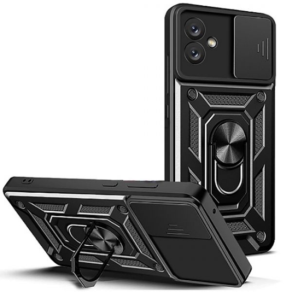 Гибкая силиконовая панель имеет жесткий металлизированный корпус и кольцо-подставку для пальца. Чехол способен выдержать даже сильные удары и царапины.