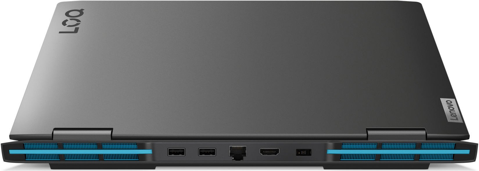 Корпус Lenovo LOQ имеет сдержанный серый цвет с яркими деталями на разных частях ноутбука. На боковых панелях расположены порты для подключения дополнительной мышки, клавиатуры, монитора или других периферийных устройств. Три порта USB 3.2, один USB-C 3.2 с поддержкой Power Delivery 140 Вт и DisplayPort 1.4, один HDMI и комбинированный порт для подключения наушников combo jack (3.5mm).