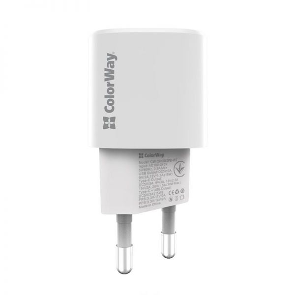 Характеристики Сетевое зарядное устройство ColorWay GaN PD Port USB PPS (Type-C PD + USB QC3.0) (33W) White (CW-CHS043PD-WT)