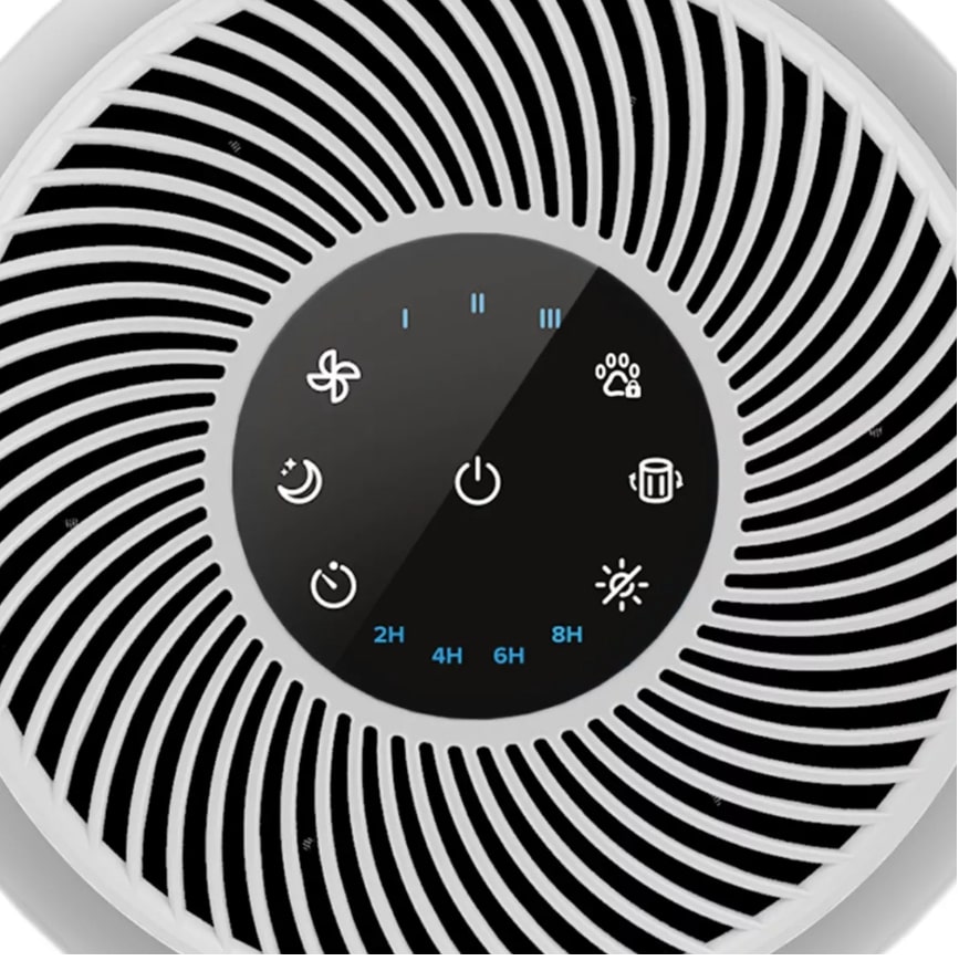 Очиститель Levoit оснащен светодиодной сенсорной панелью, на которой удобно управлять его функциями: выбирать скорость вентилятора, режим, ставить таймер, настраивать подсветку и защиту от животных.