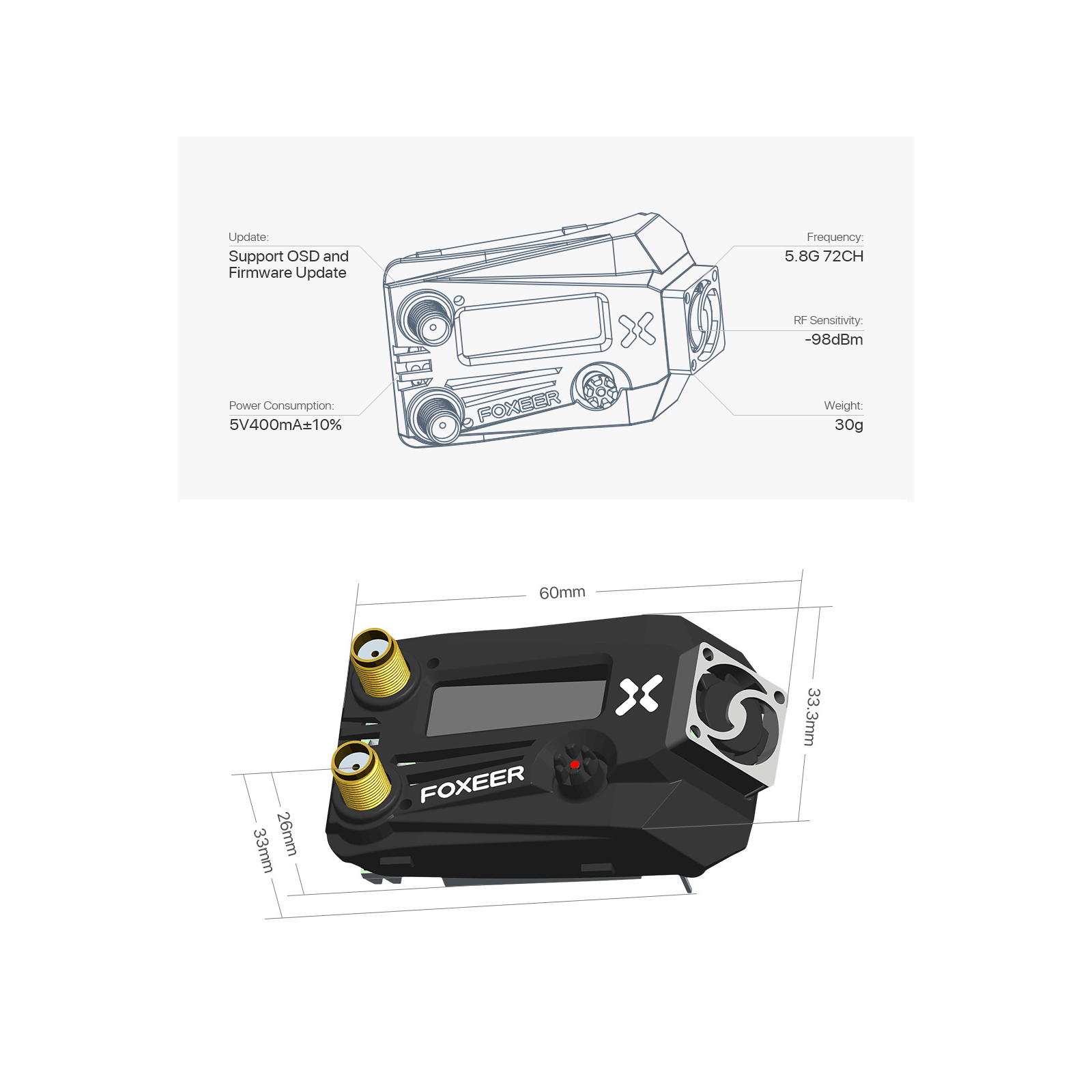 Характеристики Видеоприемник Foxeer WildFire 5.8GHz 72CH Black for Fatshark FPV Goggles (MR1622)