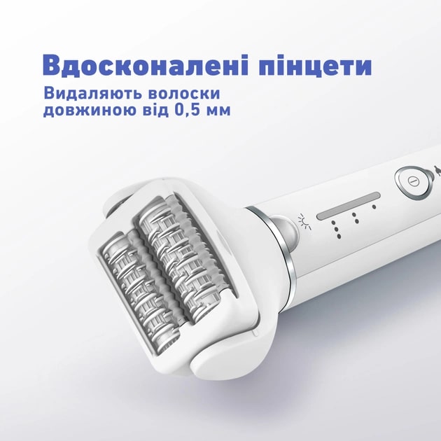 Светодиодный индикатор эпилятора предупреждает вас о чрезмерном давлении на кожу, позволяя поддерживать комфортное и эффективное удаление волос. Подсветка также помогает вам не пропустить ни одной волосинки даже в труднодоступных местах.