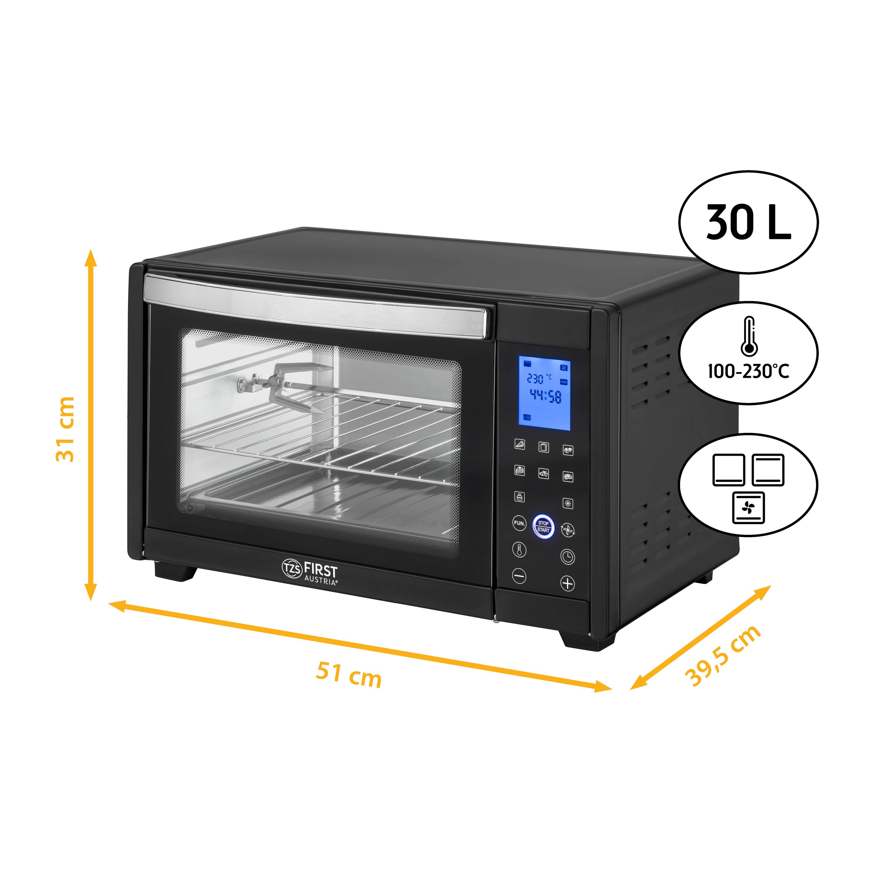 Полностью черная, заостренная с окантовкой из нержавеющей стали, компактная мини-духовка с внутренней подсветкой и бесступенчатой регулировкой температуры до 230°С не только хорошо выглядит, но и экономит время и нервы при приготовлении пищи. Запечь, приготовить на гриле, поджарить, поджарить – все получается без особых усилий. Вы также экономите деньги по сравнению с обычными духовками: мини-печь во много раз более энергоэффективна.