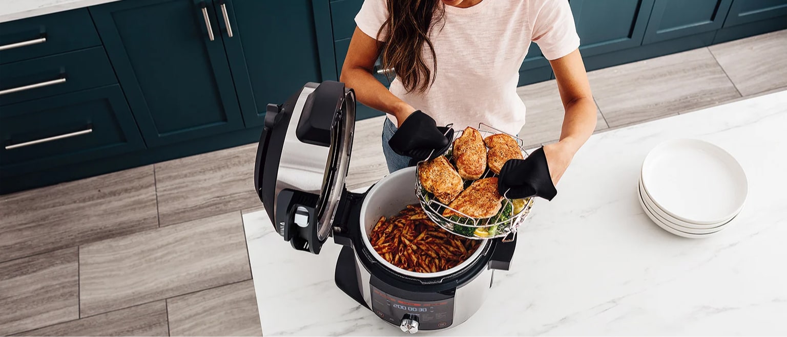 Одно устройство способно заменить гриль, сковороду, кастрюлю, йогуртницу, скороварку, пароварку, конвекционную плиту, фритюр, сушку, и в качестве бонуса вы получите еще и смарт-термощуп для точного контроля готовности блюд! Мультиварка-скороварка Ninja Foodi MAX OL750UK вмещает целую курицу с большим объемом, накормит за один раз 6 человек полноценным приемом пищи с двухъярусной решеткой, и, конечно, обладает антипригарным покрытием и удобна в использовании.