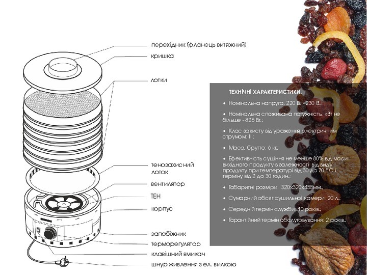 Электросушилка ЭСП2 ЭКО предназначена для сушки яблок, груш, вишен, грибов, лекарственных трав, а также мяса и рыбы, и все это вы сможете сделать самостоятельно в домашних условиях. Принцип работы достаточно прост: теплый воздух из корпуса поднимается через металлические лотки с мелкой сеточкой и равномерно подсушивает продукты. Для достижения лучшего результата лотки перекладывают между собой в процессе сушки. Температурный диапазон от 30 до 90°С. в отличие от пластиковых сушилок.