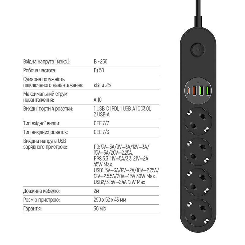 Характеристики Фильтр питания ColorWay CW-CHE44PDB 4 розетки, 4USB (Type-C PD20W + 3USB QC3.0) (45W), 2м, Black