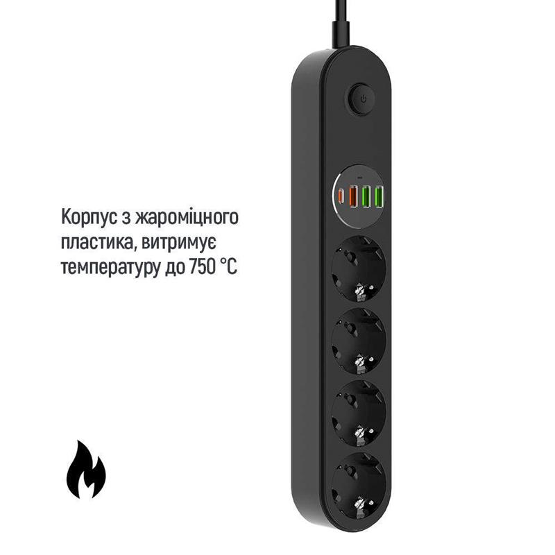 Удлинитель с четырьмя сетевыми розетками 220В и четырьмя USB-портами. Защитные шторки Child Security Door обеспечивают безопасность, а автоматическая балансировка нагрузки распределяет мощность между USB-портами (до 45W). Три USB-порта поддерживают быструю зарядку Quick Charge 3.0, а четвертый порт USB-C PD – PD с поддержкой Apple – fast charging. Удобная кнопка включения/выключения и светодиодная индикация сделают пользование еще более удобным. Этот удлинитель позволяет не только подключать электроприборы, но и одновременно заряжать до четырех мобильных устройств, таких как смартфоны, планшеты, внешние батареи и т.п., поддерживающие зарядку через порт USB. Контактные группы розеток изготовлены из высококачественного медного сплава, а корпус из огнеупорного пластика, устойчивого к температурам до 750°C. Удлинитель также имеет заземление и защиту от перенапряжения, что делает безопасным.