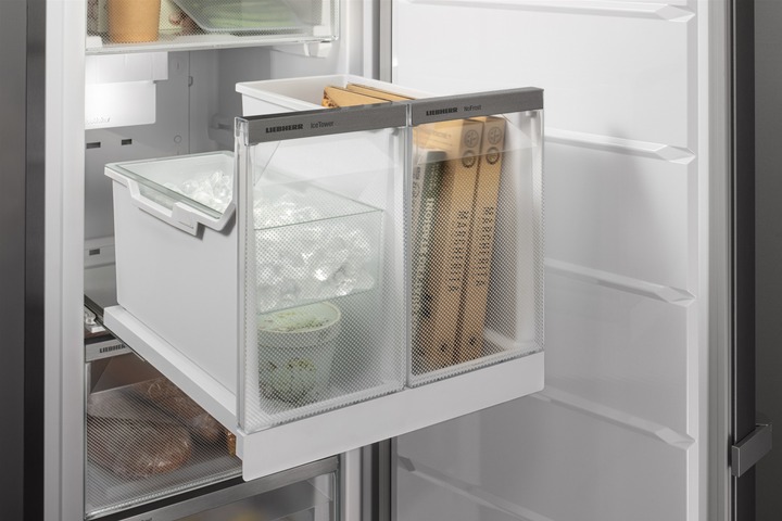 Благодаря запасу кубиков льда весом 5,7 кг система IceTower гарантирует, что на вашей вечеринке охлаждённые напитки никогда не закончатся. Лопатка для льда и выдвижная полка на телескопических направляющих обеспечивают удобный доступ к кубикам льда. Благодаря дополнительному лотку можно изготовить небольшое количество льда и одновременно хранить под ним замороженные продукты. В соседнем выдвижном контейнере также есть место для размещения продуктов.