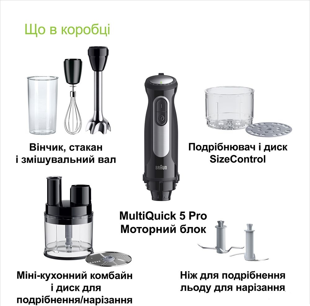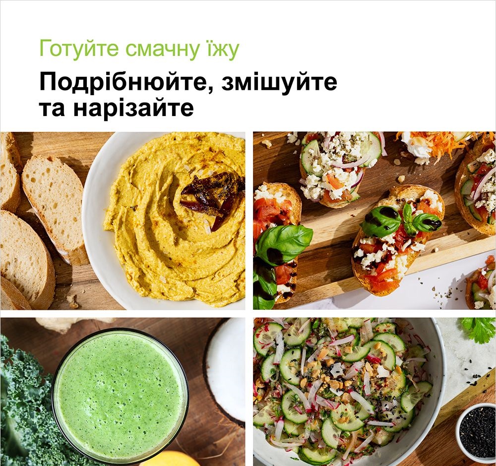 | Комплектация | насадка измельчитель 500 мл, крышка-редуктор мини-кухонний комбайн для насадки измельчитель на 500 мл, диск терка/шинковка (тонкая), вставка-измельчитель с диском SizeControl, измельчительный нож, нож для колки льда, венчик, мерный стакан 600 мл |