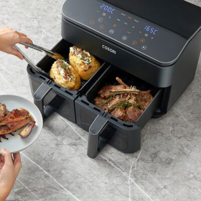 Аэрофритюрница Cosori Dual Basket имеет вместительный объем 8,5 литра с двумя независимыми корзинами, что позволяет готовить два блюда одновременно. Благодаря окнам и внутренним освещениям в каждой корзине обеспечивается четкий обзор без открывания корзин.
