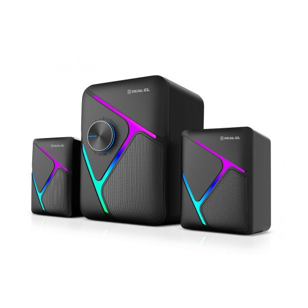 REAL-EL M-320 имеет яркую RGB подсветку, которая добавляет стилю и создает незабываемую атмосферу во время прослушивания. Регулятор громкости с подсветкой расположен на передней сабвуферной панели, что позволяет быстро и легко настроить звук под ваши потребности.